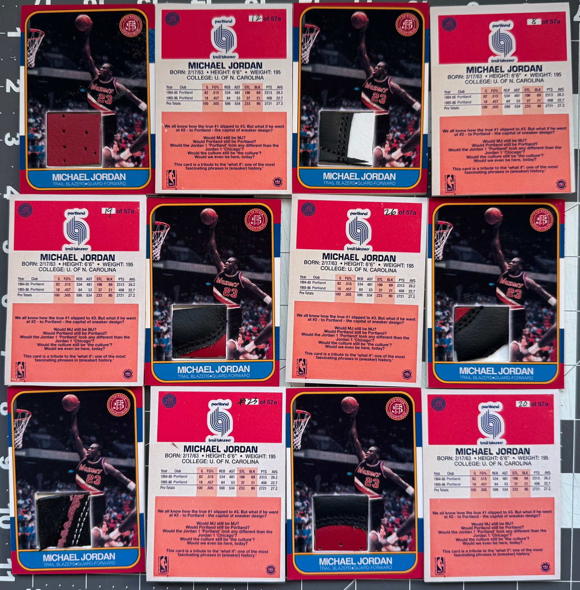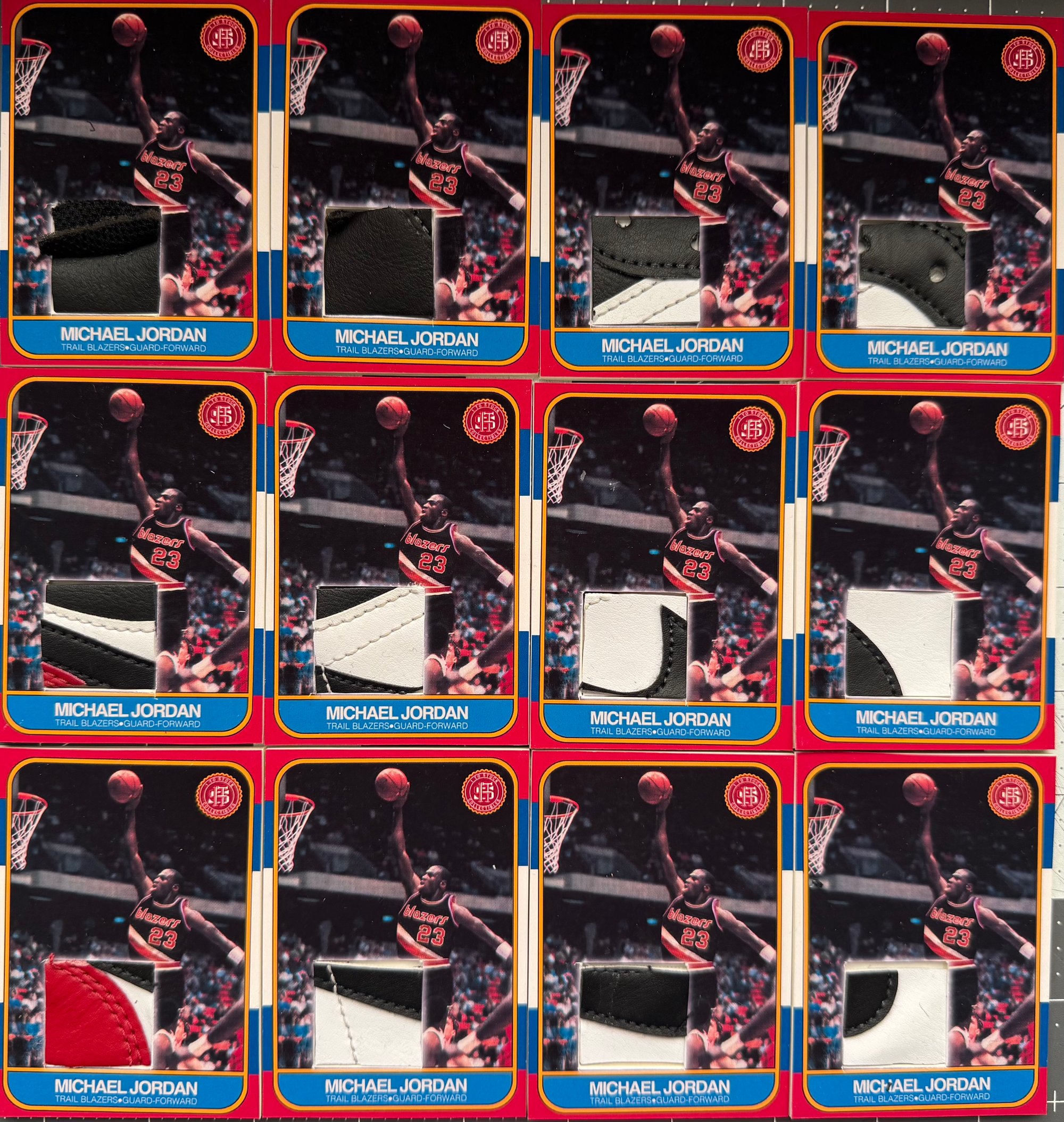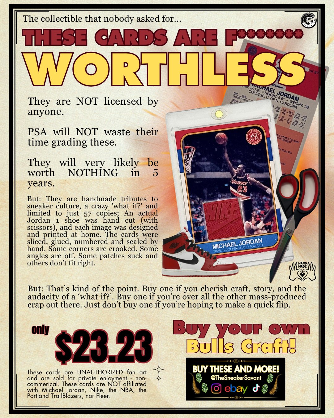 Because it’s ridiculous, handmade sneaker satire built from an actual cut-up Jordan 1. Each card was sliced, glued, printed, patched, and sealed at home — corners crooked, angles off, imperfections included. Only 57 exist, because that’s all you felt like making.